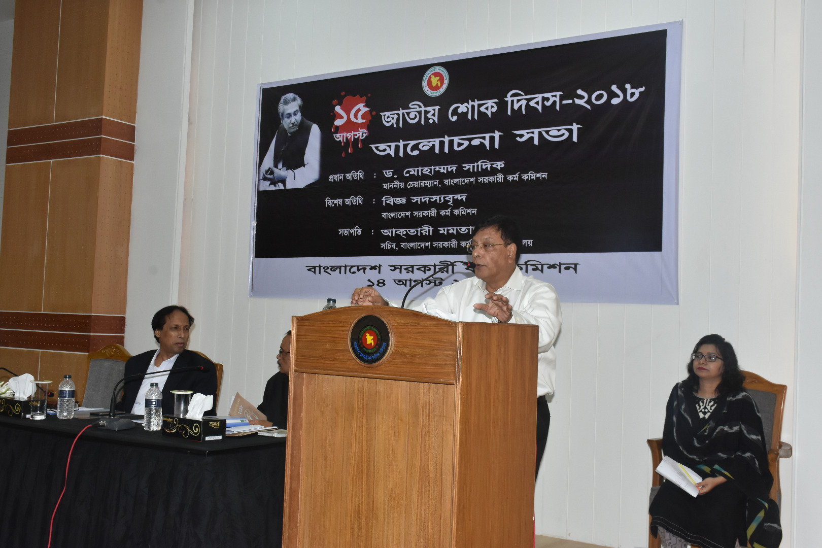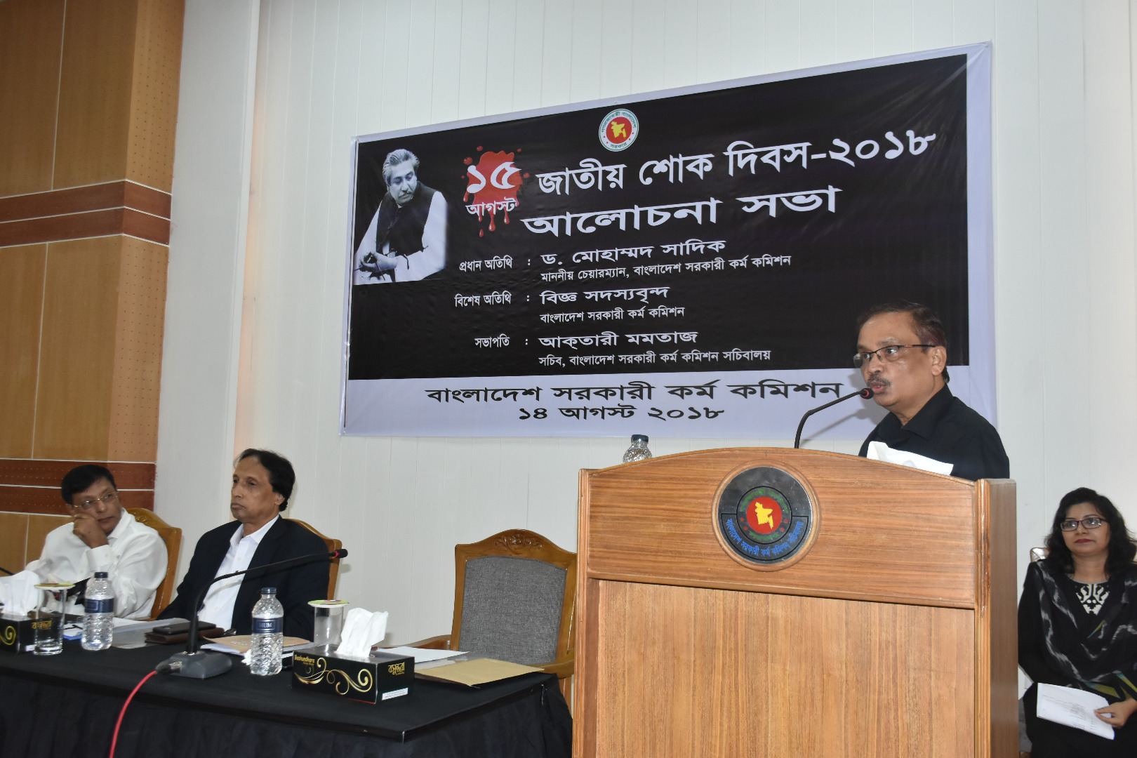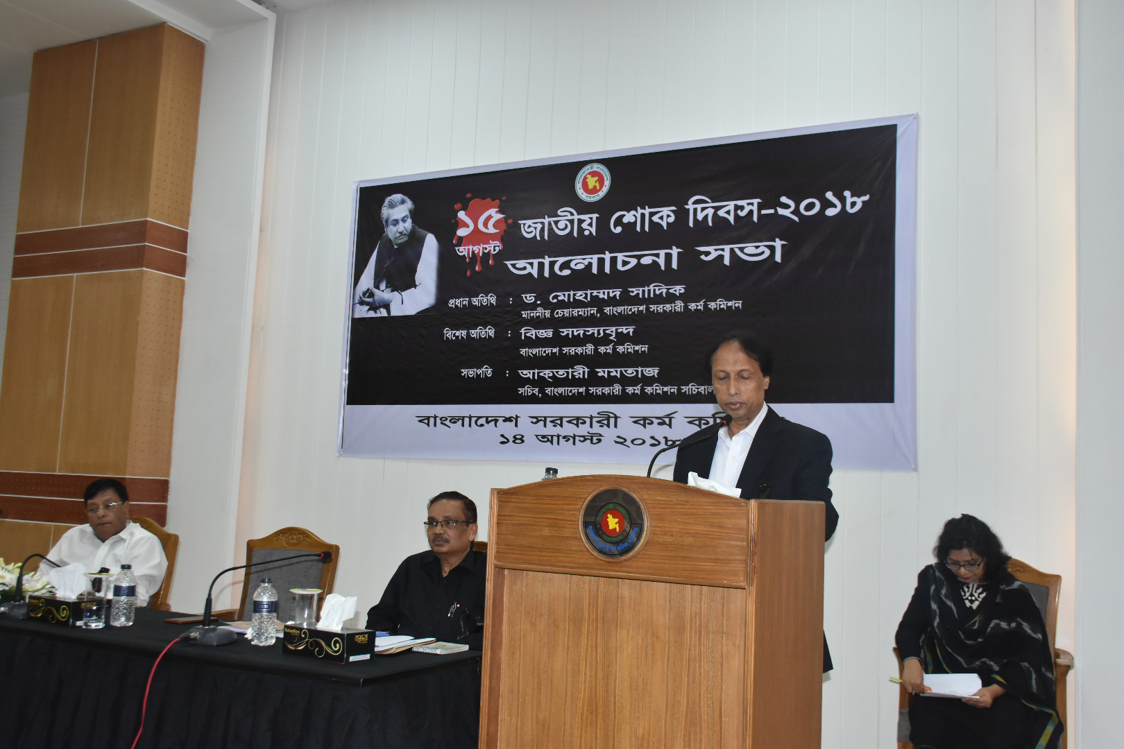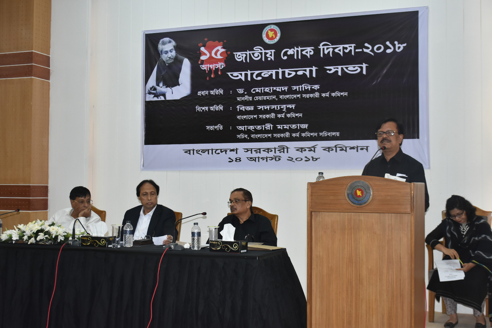 জাতির পিতা বঙ্গবন্ধু শেখ মুজিবুর রহমান-এঁর শাহাদাত বার্ষিকী ও জাতীয় শোক দিবস উপলক্ষে বাংলাদেশ সরকারী কর্ম কমিশনে ১৪ আগস্ট ২০১৮ তারিখ বিকাল ৩:০০ ঘটিকায় আলোচনা সভার আয়োজন করা হয়। ভাবগম্ভীর এবং শোকাবহ পরিবেশে আলোচনা সভায় স্বাধীন বাংলাদেশের মহান স্থপতি, সর্বকালের সর্বশ্রেষ্ঠ বাঙ্গালী জাতির পিতা বঙ্গবন্ধু শেখ মুজিবুর রহমানের ঘটনাবহুল জীবনী নিয়ে আলোকপাত করা হয়। অনুষ্ঠানে স্বাধীন বাংলাদেশ সৃষ্টিতে মহান এ নেতার অবদান বিনম্র শ্রদ্ধার সাথে স্মরণ করা হয়। সভায় এই শোককে শক্তিতে রূপান্তর করে জাতির পিতার স্বপ্নের সোনার বাংলা গড়ার প্রত্যয় ব্যক্ত করা হয়। অনুষ্ঠানে প্রধান অতিথি হিসেবে উপস্থিত ছিলেন বাংলাদেশ সরকারী কর্ম কমিশনের চেয়ারম্যান ড. মোহাম্মদ সাদিক অনুষ্ঠানে সভাপতিত্ব করেন বেগম আক্তারী মমতাজ, সচিব, বাংলাদেশ সরকারী কর্ম কমিশন সচিবালয়। কমিশনের বিজ্ঞ সদস্যবৃন্দ এবং সকল কর্মকর্তা/কর্মচারীবৃন্দ উক্ত অনুষ্ঠানে উপস্থিত ছিলেন।